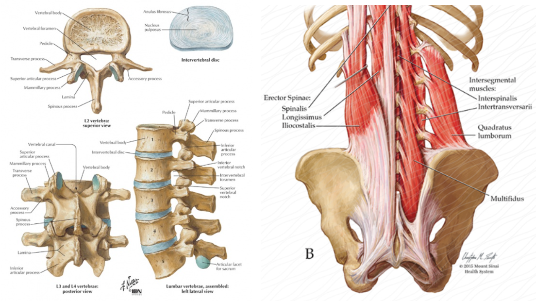 The lumbar spine is made up of five vertebrae stacked on top of one another. Between each vertebra sits an intervertebral disc, which acts as a shock absorber and allows the spine to move smoothly under load. At the back of each vertebra are small joints known as facet joints, which help guide movement and provide control. Surrounding these structures are muscles and ligaments that support posture and help control motion.